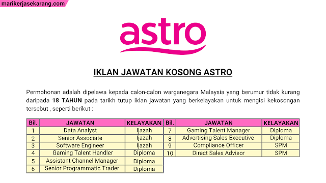 Jawatan Kosong Astro Mac 2021There are 30 Kerja Kosong Astro in and related to Jawatan Kosong Astro Jobs for Astro Astro Job Openings Astro Job Vacancies Astro Job Opportunities at. To apply by online please click the Apply button below. Astro Malaysia Holdings Berhad ASTRO Lokasi Kekosongan.